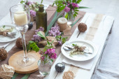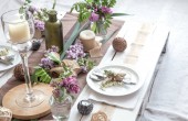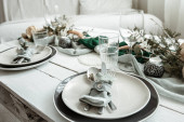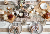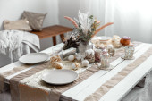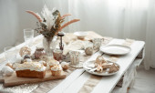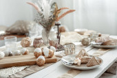 Świąteczny stół z pięknym ustawieniem, dekoracyjne szczegóły, jajka i ciasto wielkanocne.