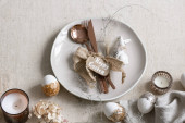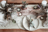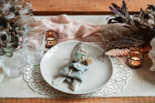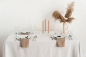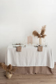 Puste talerze i szklanki na ozdobionym stole na Wielkanoc. Piękne ustawienie stołu w stylu hygge.