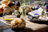 Świeże domowe wypieki wielkanocne na świątecznym stole ze szczegółami dekoracji na rozmytym tle.