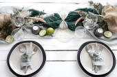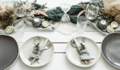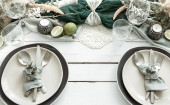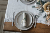 Stylowy świąteczny stół ze skandynawskimi detalami dekoracyjnymi na drewnianej powierzchni.