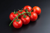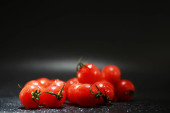 Pomidory na gałęzi z kroplami wody, czarne szkło z plamami wody zbliżenie, przestrzeń kopiowania, szablon,