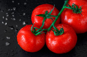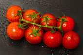 Pomidory na gałęzi z kroplami wody, czarne szkło z plamami wody zbliżenie, przestrzeń kopiowania, szablon,