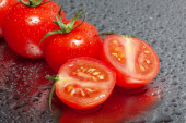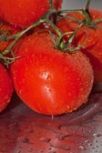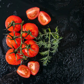 Tomatoes with dill water drops on black glass, water stains, close-up, copy space, template,