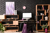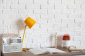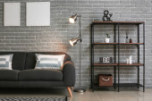 Zdjęcie "Nowoczesna lampa z sofą i półką na ceglanym tle" może być wykorzystywane do celów osobistych i komercyjnych zgodnie z warunkami zakupionej licencji Royalty-free. Obraz jest dostępny do pobrania w jakości wysokiej rozdzielczości do 5760x3840.
