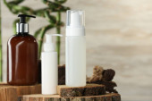 Butelki z naturalnym szamponem na białym tle