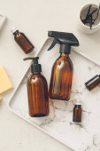 Butelki z naturalnym szamponem i pędzlem na jasnym tle