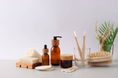 Butelka z naturalnym szamponem, mydłem i pędzlami na grunge tle