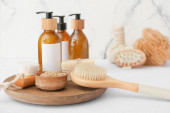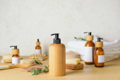 Butelki z naturalnym szamponem i pędzlem na jasnym tle