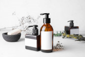 Butelki z naturalnym szamponem na jasnym tle