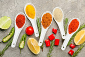 Łyżki z różnymi przyprawami, warzywami i ziołami na podłożu grunge