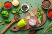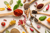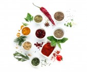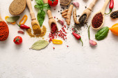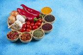 Miski z różnymi przyprawami i warzywami na jasnym tle