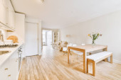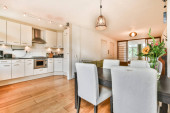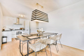Zdjęcie "Nowoczesny umeblowany salon z kuchnią" może być wykorzystywane do celów osobistych i komercyjnych zgodnie z warunkami zakupionej licencji Royalty-free. Obraz jest dostępny do pobrania w jakości wysokiej rozdzielczości do 5760x3840.