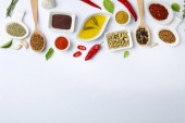 Łyżki z różnymi przyprawami i warzywami na białym drewnianym tle