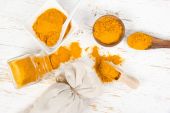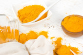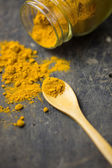 Wywrócone słoiki z różnymi przyprawami na drewnianym tle, zbliżenie