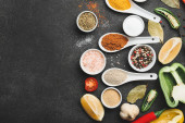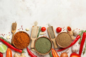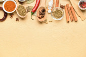 Miski z różnymi przyprawami i warzywami na tle koloru