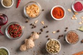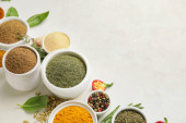 Miski z różnymi przyprawami na tle koloru, zbliżenie