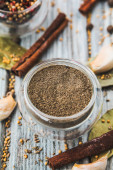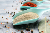 Łyżka z pieprzem w proszku na grunge tle, zbliżenie