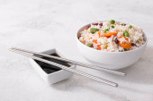 Miska z smacznym ryżem, zielonym groszkiem i jajkiem na tle koloru