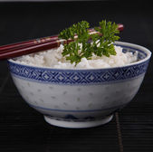 Talerz ze smacznym ryżem, brokułami i mięsem na ciemnym tle