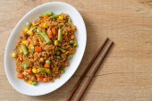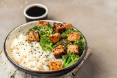 Talerz ze smacznym ryżem i brokułami na ciemnym tle