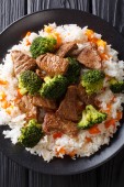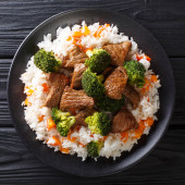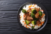 Miska ze smacznym ryżem, mięsem i warzywami na drewnianym tle