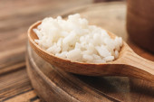 Miska z smacznym ryżem i warzywami na ciemnym drewnianym tle