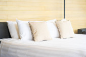 Zdjęcie "Biała wygodna poduszka na dekoracji łóżka wnętrze pokoju w ośrodku hotelowym" może być wykorzystywane do celów osobistych i komercyjnych zgodnie z warunkami zakupionej licencji Royalty-free. Obraz jest dostępny do pobrania w jakości wysokiej rozdzielczości do 5760x3840.