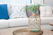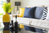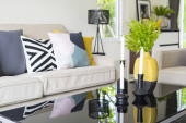 Kwiaty w wazonie na drewnianym stoliku w salonie wnętrze z szarą sofą z poduszkami.