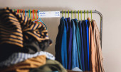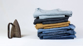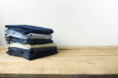 Zdjęcie "Koncepcja ubrań. Stos odzieży na drewnianej ławce przy ścianie Whaite. Niebieski odcień marynarki" może być wykorzystywane do celów osobistych i komercyjnych zgodnie z warunkami zakupionej licencji Royalty-free. Obraz jest dostępny do pobrania w jakości wysokiej rozdzielczości do 5760x3840.