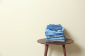 Koncepcja ubrań. Stos odzieży na drewnianej ławce przy ścianie Whaite. Niebieski odcień marynarki