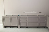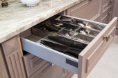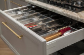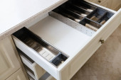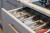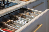 Close up widok otwartej szuflady kuchennej z sztućcami