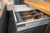 Otwarta szuflada z pustą tacą na sztućce w nowoczesnej kuchni z marmurowym blatem