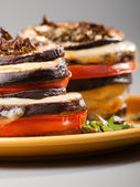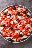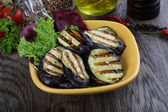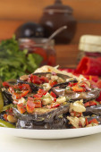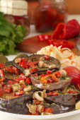 Bakłażan fermentowany z czerwonym pieprzem, marynowany czosnek w drewnianej płycie na niebieskim stole. Zbliżenie