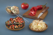 Zdjęcie "Bakłażan fermentowany z czerwonym pieprzem, marynowany czosnek w drewnianej płycie na niebieskim stole. Zbliżenie" może być wykorzystywane do celów osobistych i komercyjnych zgodnie z warunkami zakupionej licencji Royalty-free. Obraz jest dostępny do pobrania w jakości wysokiej rozdzielczości do 5760x3840.
