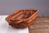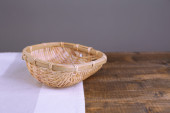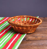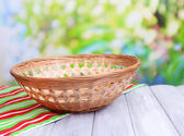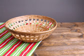 pusty wiklinowy koszyk na drewnianym stole, na jasnym tle