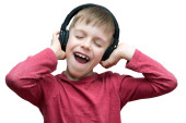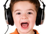 chłopiec słuchając wobec muzyka na białym tle
