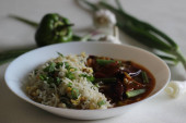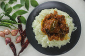 Cytrynowy ryż podawany z curry w stylu Kerala. Strzał na białym tle.