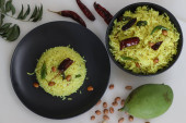 Ryż cytrynowy przygotowany przez przyprawianie gotowanego ryżu z nasionami gorczycy, smażoną soczewicą, orzeszkami ziemnymi, orzechami nerkowca, zielonymi chili, suchymi czerwonymi chili, liśćmi curry, asafoetidą, kurkumą i sokiem z limonki.