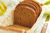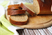 Ręce kobiet krojące chleb na drewnianej desce, zbliżenie