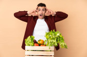 nastoletni rolnik ze świeżo zebranymi warzywami w pudełku z zaskakującym wyrazem twarzy