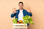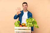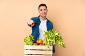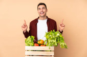 Nastolatek rolnik ze świeżo zebranymi warzywami w pudełku dający kciuki w górę gestu