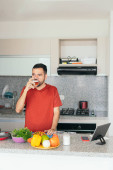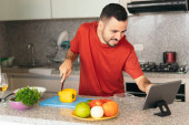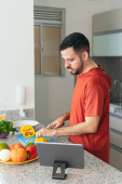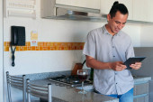 Zdjęcie "Latynos korzystający z tabletu w swojej kuchni" może być wykorzystywane do celów osobistych i komercyjnych zgodnie z warunkami zakupionej licencji Royalty-free. Obraz jest dostępny do pobrania w jakości wysokiej rozdzielczości do 5760x3840.