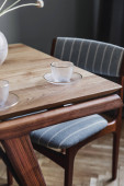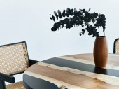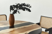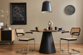 Zdjęcie "Wystrój wnętrz stylowej jadalni z rodzinnym drewnianym stołem, nowoczesnymi krzesłami, talerzem z orzechami, solą i pieprzem. Betonowa podłoga. Biała ściana. Wzór." może być wykorzystywane do celów osobistych i komercyjnych zgodnie z warunkami zakupionej licencji Royalty-free. Obraz jest dostępny do pobrania w jakości wysokiej rozdzielczości do 5760x3840.