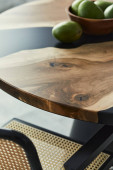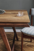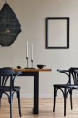 Wystrój wnętrz stylowej jadalni z rodzinnym drewnianym stołem, nowoczesnymi krzesłami, talerzem z orzechami, solą i pieprzem. Betonowa podłoga. Biała ściana. Wzór.