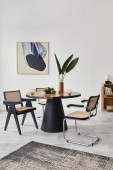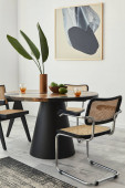 Minimalistyczna kompozycja wnętrza jadalni z drewnianym stołem, krzesłami projektowymi, suszonymi kwiatami w wazonie, czarną lampą wiszącą, malowidłami artystycznymi na ścianie i eleganckimi akcesoriami osobistymi. Wzór.
