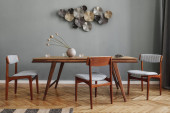 Zdjęcie "Minimalistyczna kompozycja wnętrza jadalni z drewnianym stołem, krzesłami projektowymi, suszonymi kwiatami w wazonie, czarną lampą wiszącą, malowidłami artystycznymi na ścianie i eleganckimi akcesoriami osobistymi. Wzór." może być wykorzystywane do celów osobistych i komercyjnych zgodnie z warunkami zakupionej licencji Royalty-free. Obraz jest dostępny do pobrania w jakości wysokiej rozdzielczości do 5760x3840.