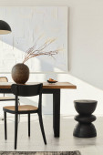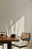 Zdjęcie "Wystrój wnętrz stylowej jadalni z rodzinnym drewnianym stołem, nowoczesnymi krzesłami, talerzem z orzechami, solą i pieprzem. Abstrakcyjne bóle na ścianie. Biała ściana. Wzór." może być wykorzystywane do celów osobistych i komercyjnych zgodnie z warunkami zakupionej licencji Royalty-free. Obraz jest dostępny do pobrania w jakości wysokiej rozdzielczości do 5760x3840.