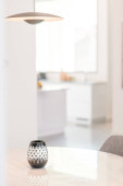 Wystrój wnętrz stylowej jadalni z rodzinnym drewnianym stołem, nowoczesnymi krzesłami, talerzem z orzechami, solą i pieprzem. Abstrakcyjne bóle na ścianie. Biała ściana. Wzór.