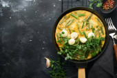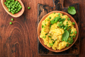 Zdjęcie "Tłuczone ziemniaki z masłem, zielony groszek, cebula, bazylia na białym tle płytek ceramicznych. Widok z bliska." może być wykorzystywane do celów osobistych i komercyjnych zgodnie z warunkami zakupionej licencji Royalty-free. Obraz jest dostępny do pobrania w jakości wysokiej rozdzielczości do 5760x3840.