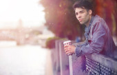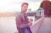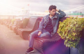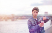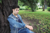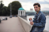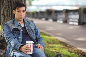 Młody człowiek spaceruje po parku w porze lunchu. Mężczyzna jest na spacerze po mieście. Student w parku.